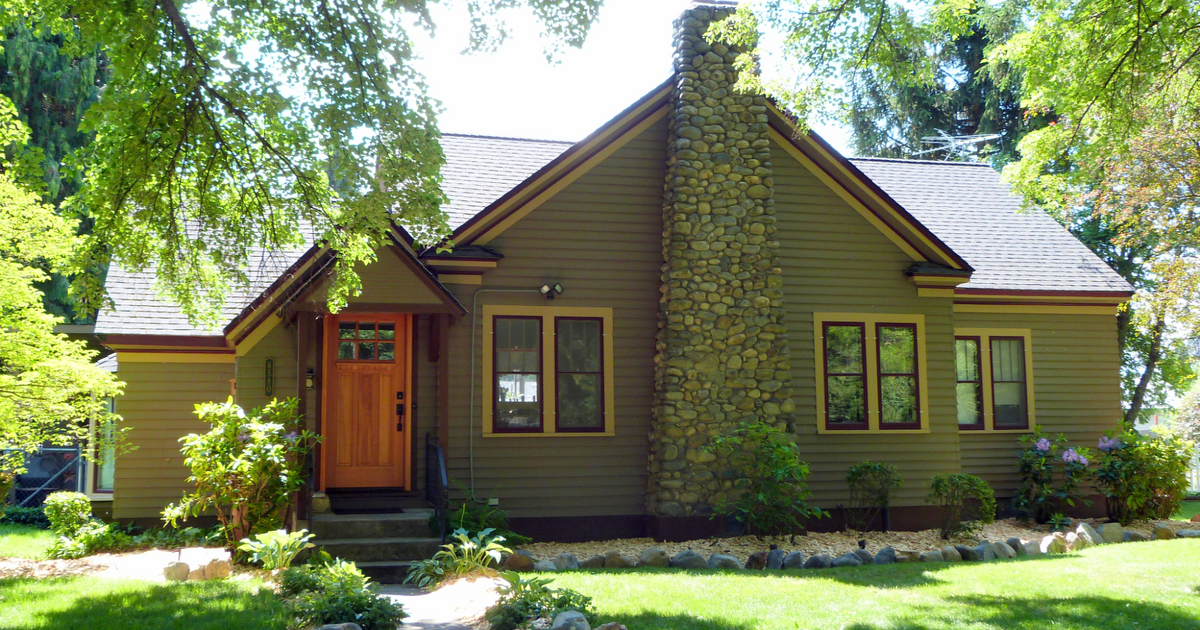 This house has green board siding that pairs nicely with the black roof. Light brown cream beige and pale.